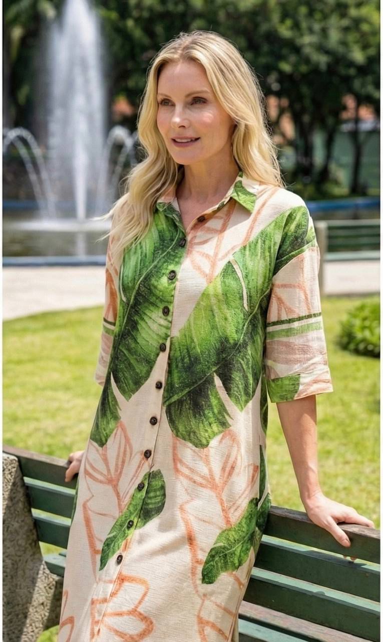 Elegante e versátil, a chemise midi traz um design atemporal com toque moderno. Confeccionada em tecido leve e confortável, ela apresenta estampa de folhagens em tons naturais que transmite frescor e sofisticação. O modelo conta com fechamento frontal por botões, mangas 3/4 e gola clássica, garantindo praticidade e estilo no dia a dia. A modelagem soltinha proporciona caimento impecável, enquanto a fenda lateral adiciona charme e liberdade de movimento.