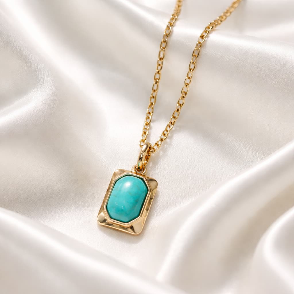 Colar em semijoia dourada com corrente de elos delicados, destacando um elegante pingente com pedra turquesa em formato retangular. A moldura dourada valoriza a cor vibrante da pedra, trazendo um toque de sofisticação e modernidade à peça.