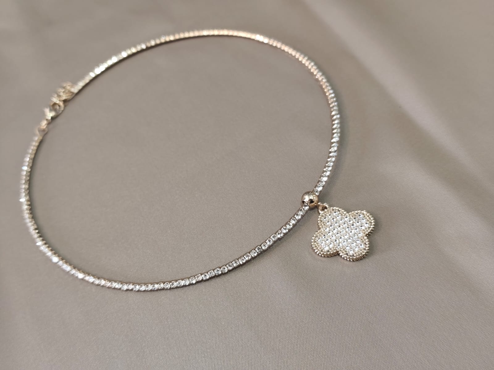 Colar delicado com corrente de strass e pingente em formato de flor cravejado com pedras brilhantes. Uma peça elegante e sofisticada, perfeita para dar um toque de brilho e charme aos seus looks. ✨