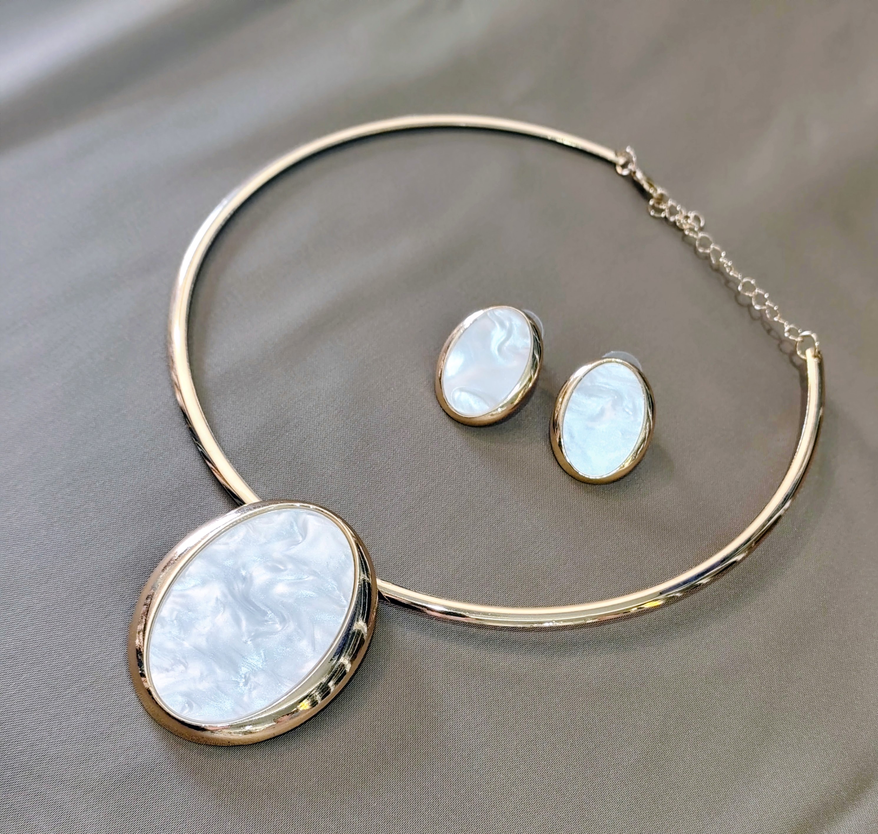 Conjunto de bijuteria elegante composto por colar e brincos com acabamento em metal dourado. O colar possui estrutura rígida e delicada, com corrente ajustável para melhor encaixe, destacando uma pedra oval central com efeito perolado e textura marmorizada, que proporciona brilho suave e sofisticado. Os brincos acompanham o mesmo design da pedra perolada, criando harmonia e elegância ao conjunto.