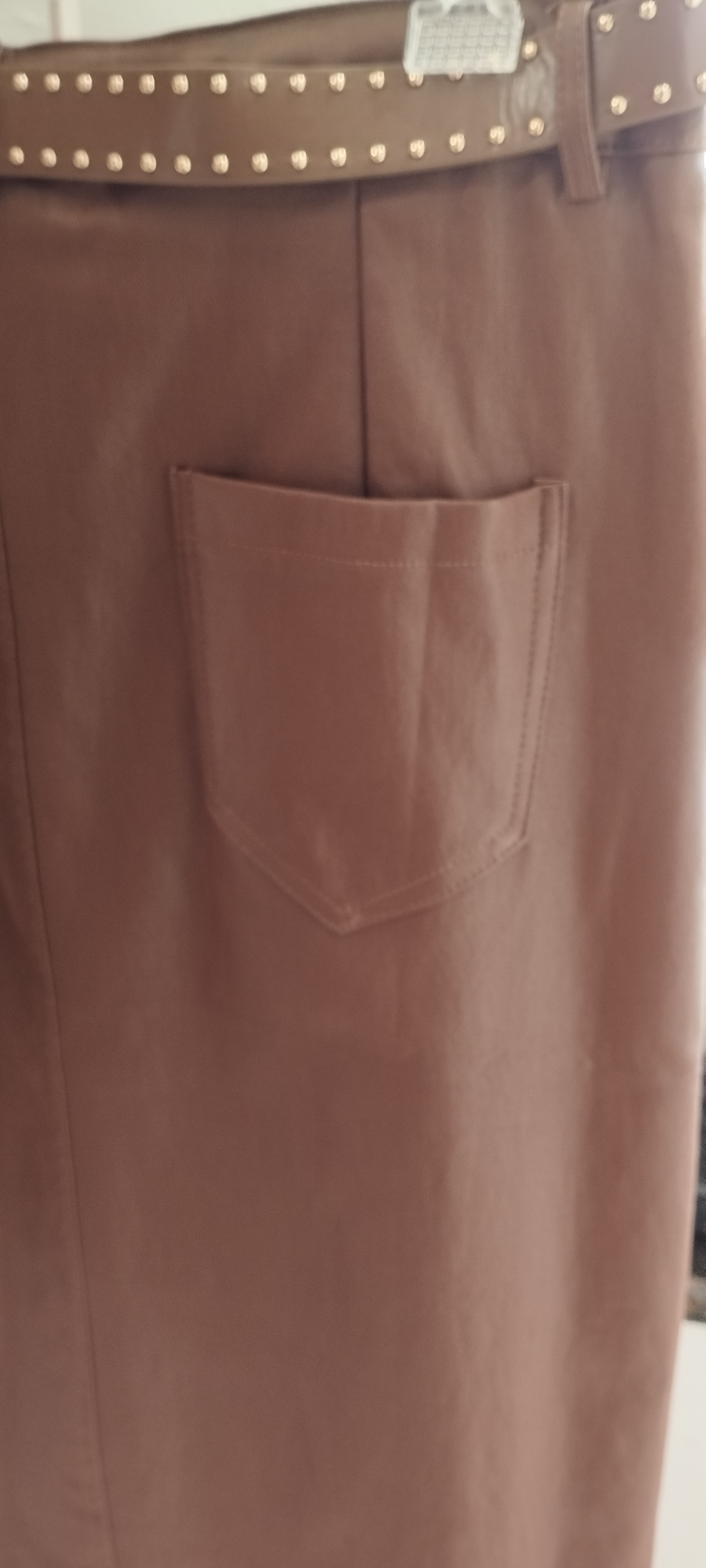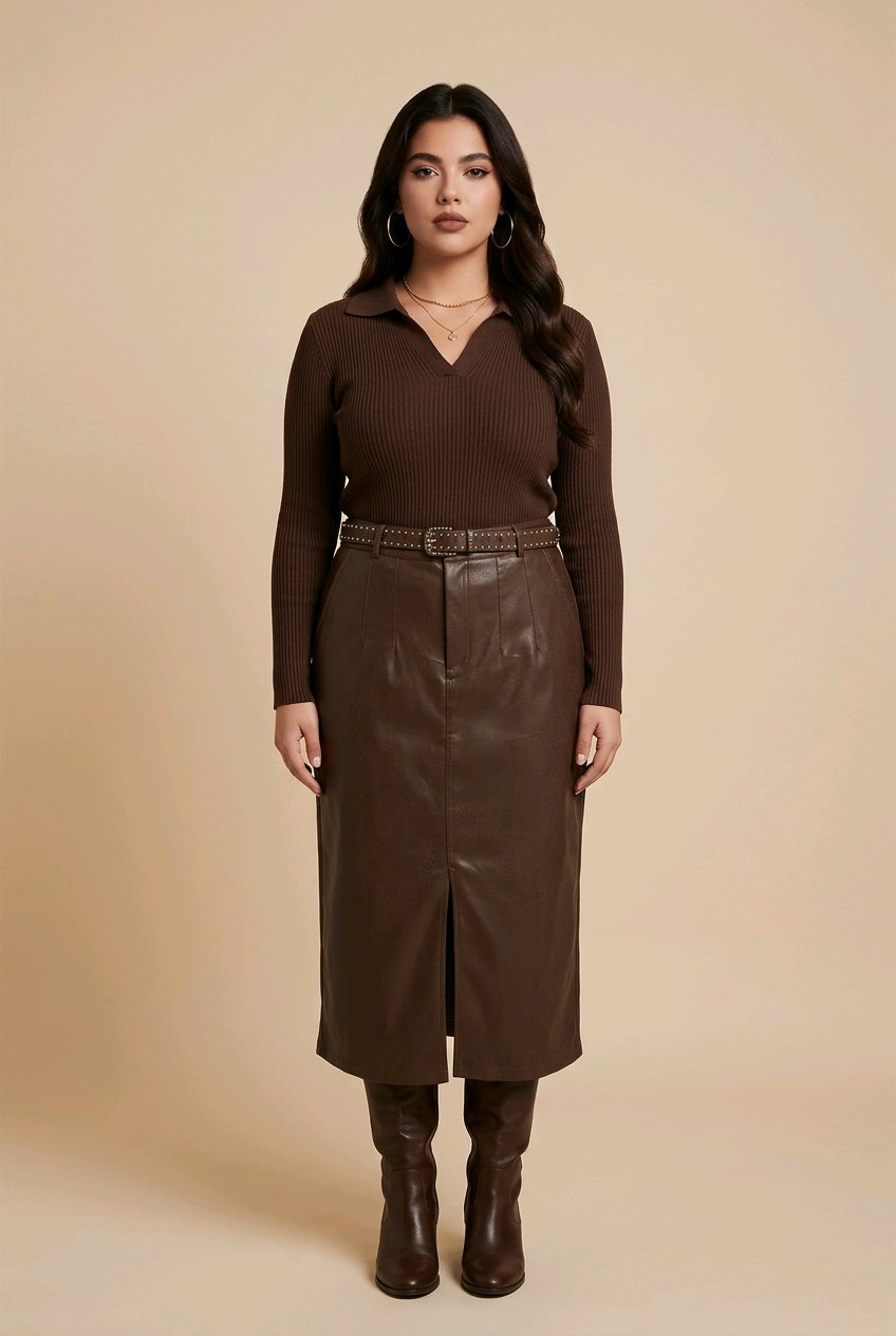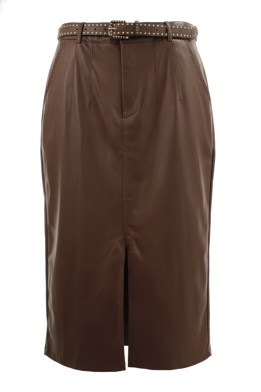 Saia midi confeccionada em couro ecológico, com acabamento sofisticado e toque macio. O modelo possui cintura alta com cinto do mesmo material, destacando delicadamente a silhueta. Apresenta recortes frontais elegantes e fenda frontal, que traz movimento e modernidade à peça.