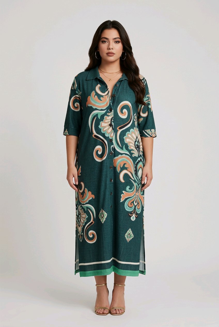Elegante e versátil, a chemise midi traz um design atemporal com toque moderno. Confeccionada em tecido leve e confortável, ela apresenta estampa de folhagens em tons naturais que transmite frescor e sofisticação. O modelo conta com fechamento frontal por botões, mangas 3/4 e gola clássica, garantindo praticidade e estilo no dia a dia. A modelagem soltinha proporciona caimento impecável, enquanto a fenda lateral adiciona charme e liberdade de movimento.