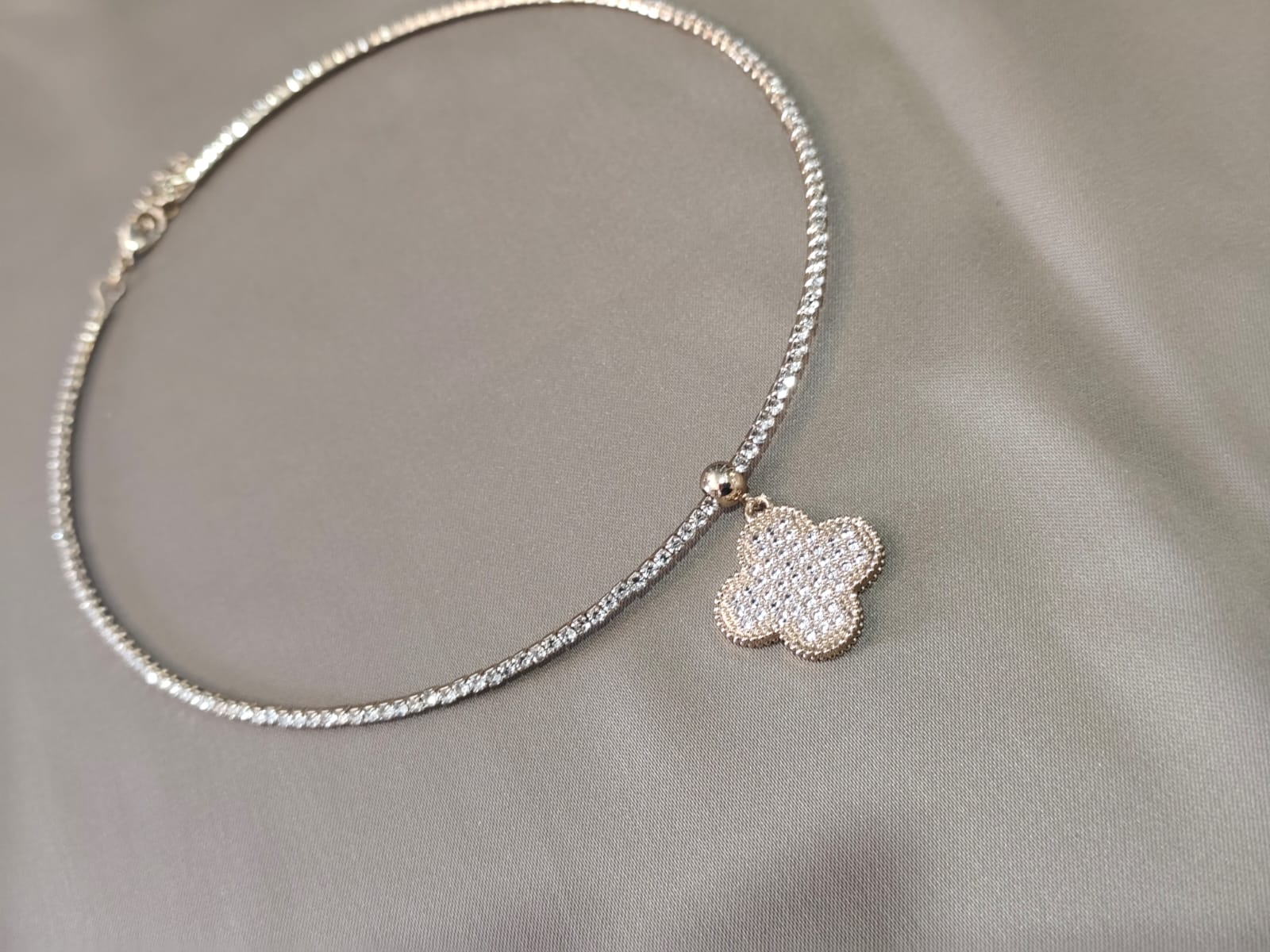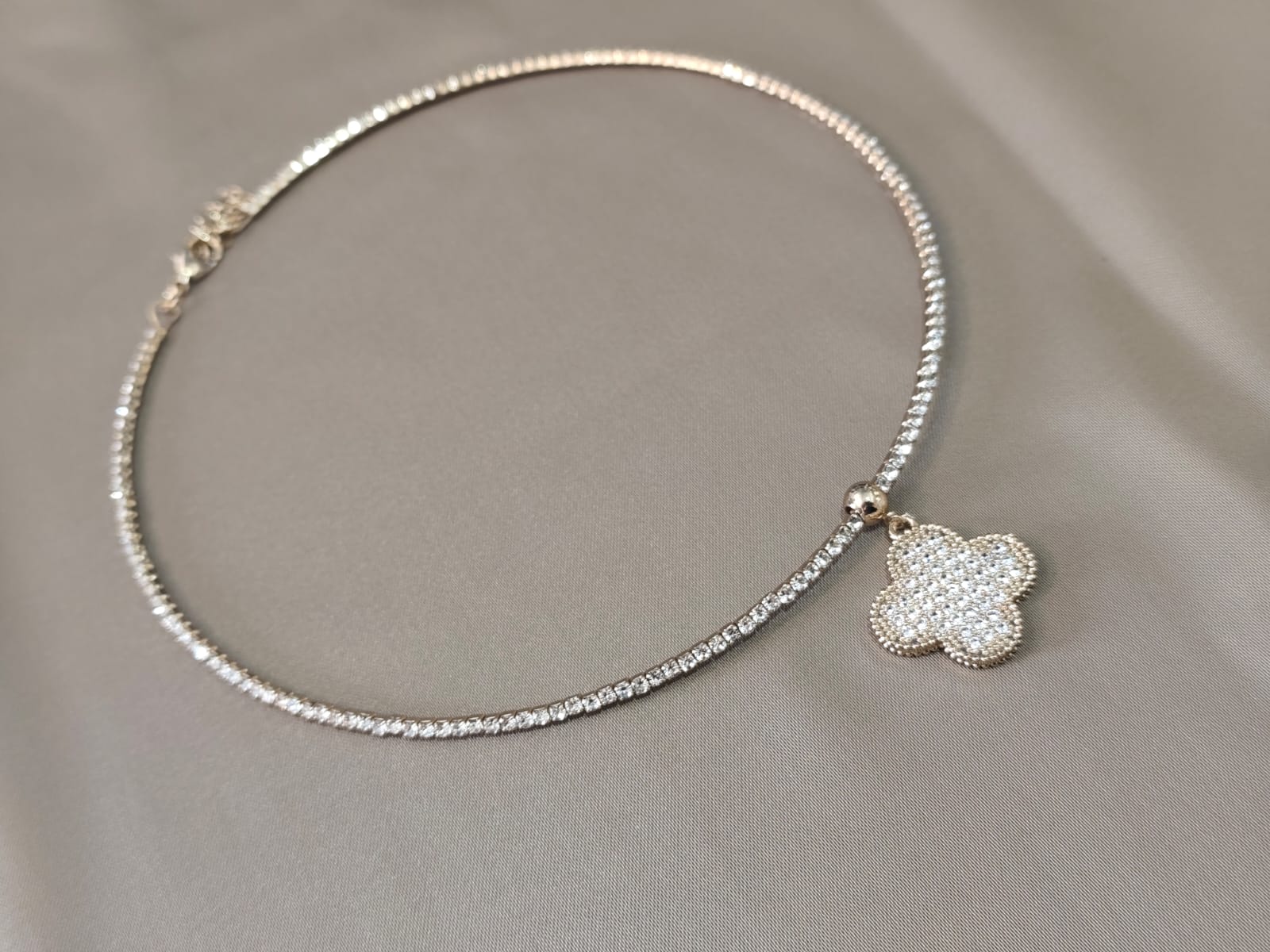 Colar delicado com corrente de strass e pingente em formato de flor cravejado com pedras brilhantes. Uma peça elegante e sofisticada, perfeita para dar um toque de brilho e charme aos seus looks. ✨
