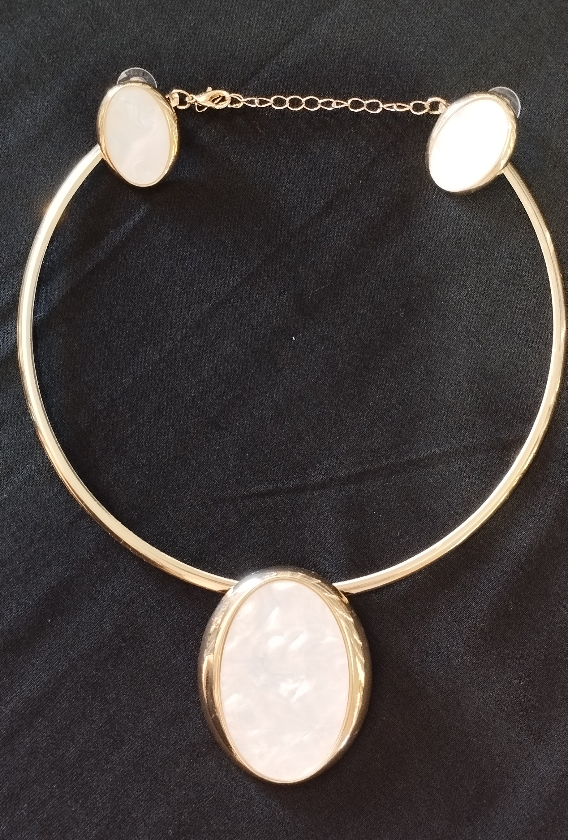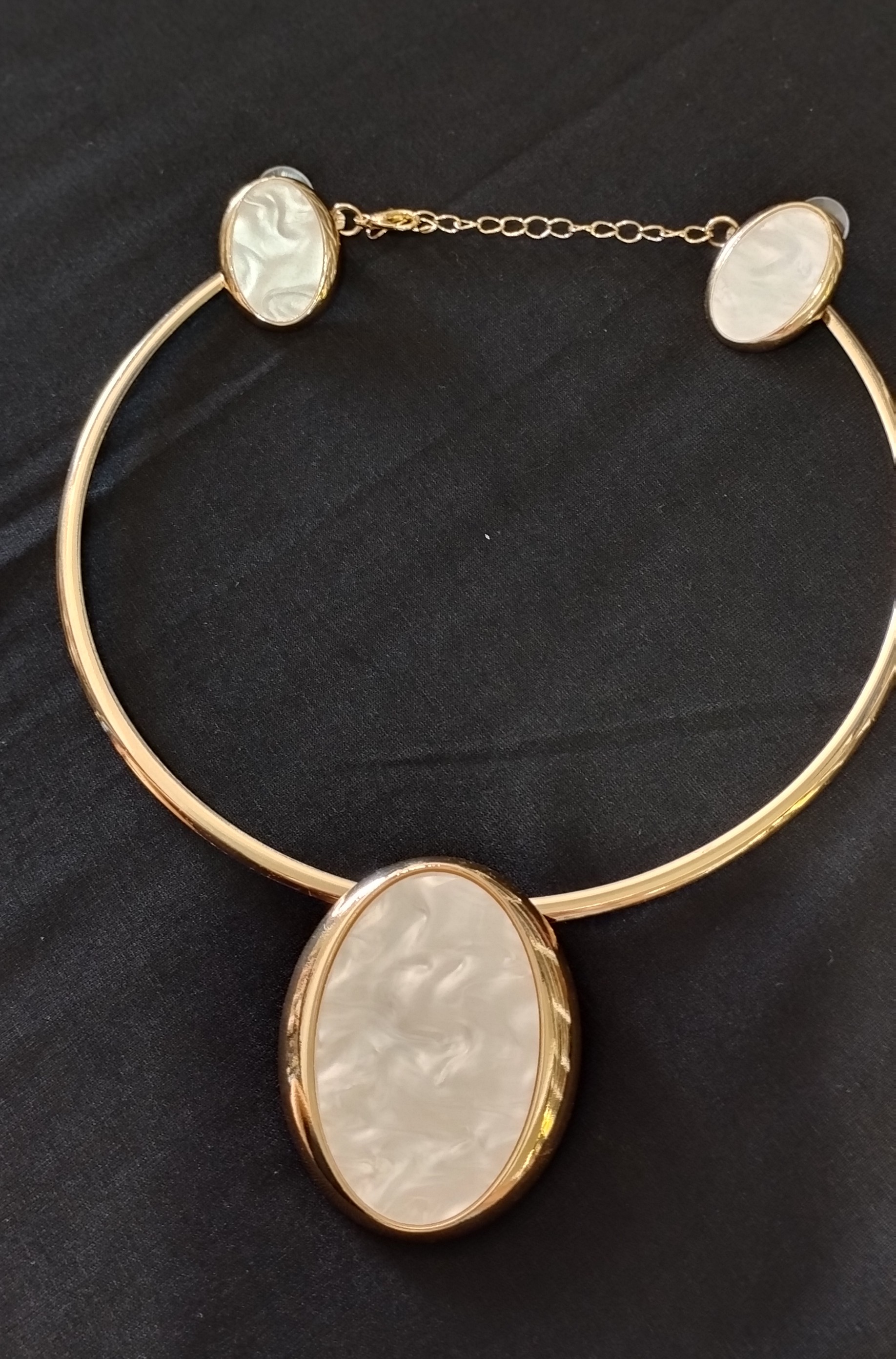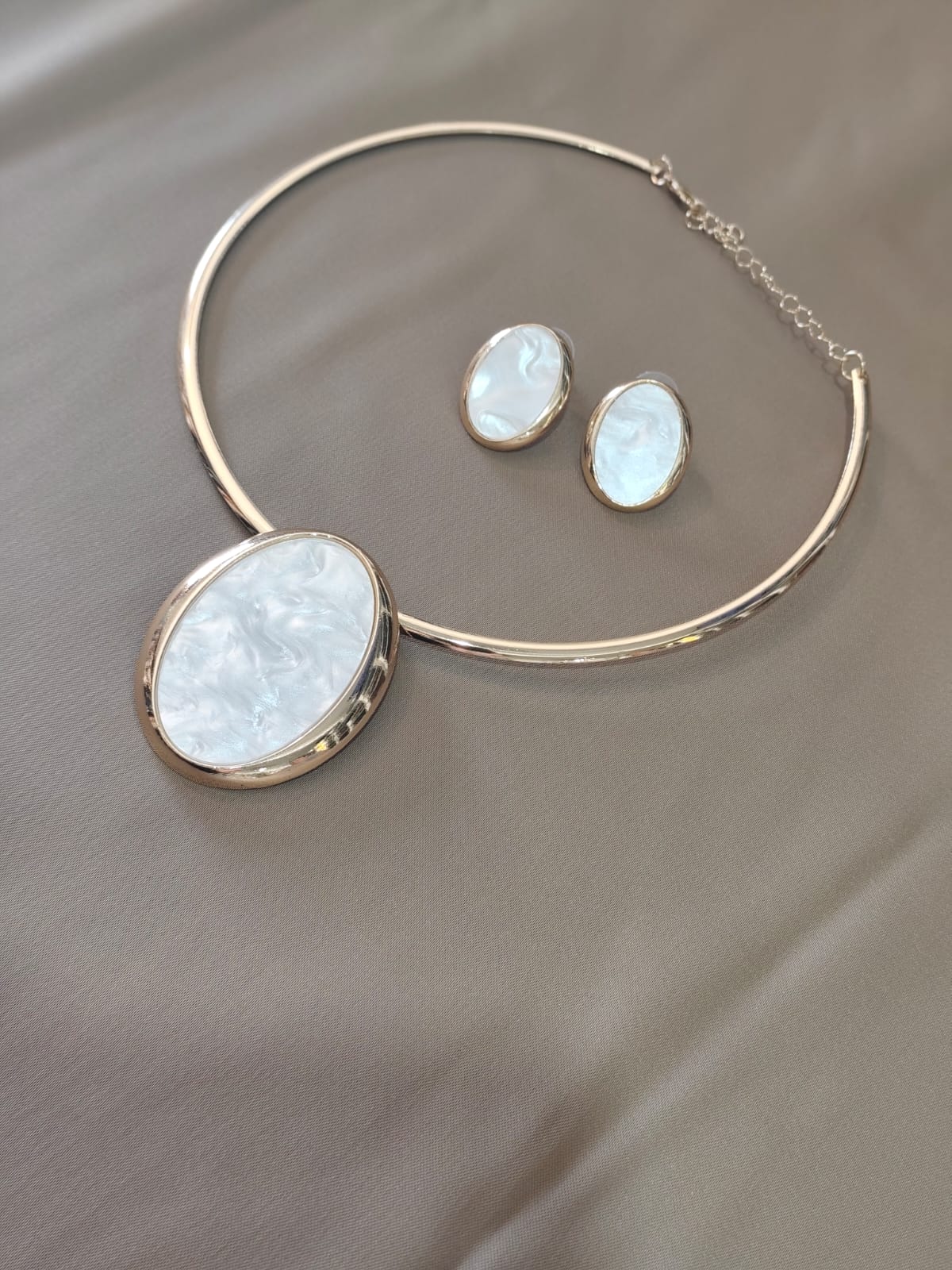 Conjunto de bijuteria elegante composto por colar e brincos com acabamento em metal dourado. O colar possui estrutura rígida e delicada, com corrente ajustável para melhor encaixe, destacando uma pedra oval central com efeito perolado e textura marmorizada, que proporciona brilho suave e sofisticado. Os brincos acompanham o mesmo design da pedra perolada, criando harmonia e elegância ao conjunto.